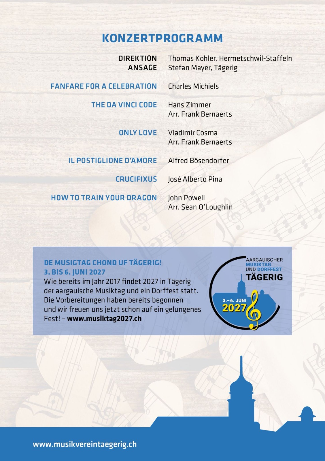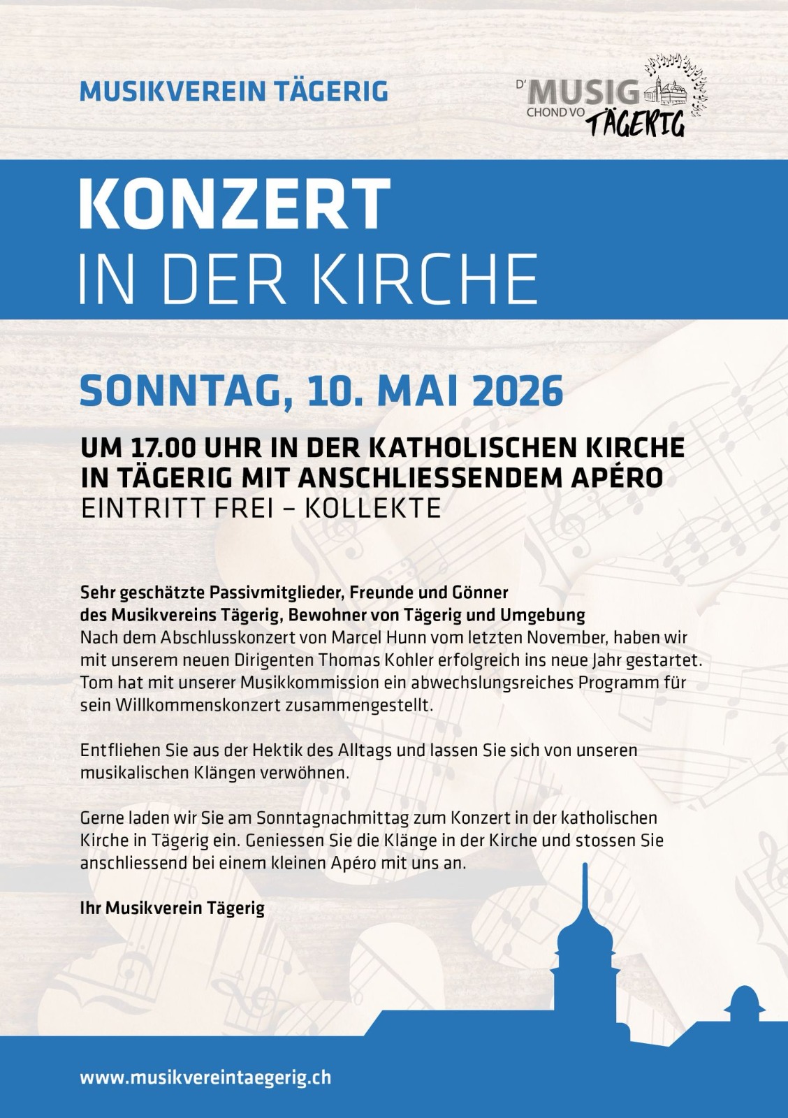 Herzlichen Dank für Ihren Besuch auf der Homepage. Schauen Sie rein und überzeugen Sie sich von der Vitalität des Musikvereins Tägerig. Sehen und hören Sie uns live an einem unserer Anlässe!